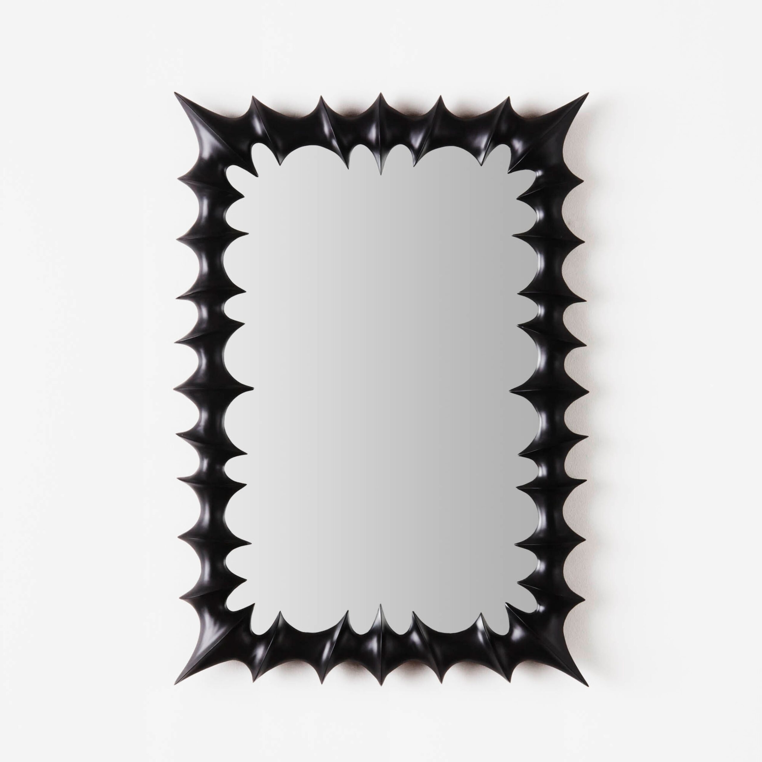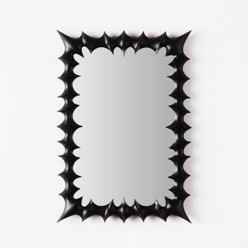 The Brutalist Mirror Small Black is defined by its distinctive, sculptural frame, crafted from solid beech and carved by skilled artisans. Finished with a black wax, it has a smooth, matte surface that enhances its bold character.