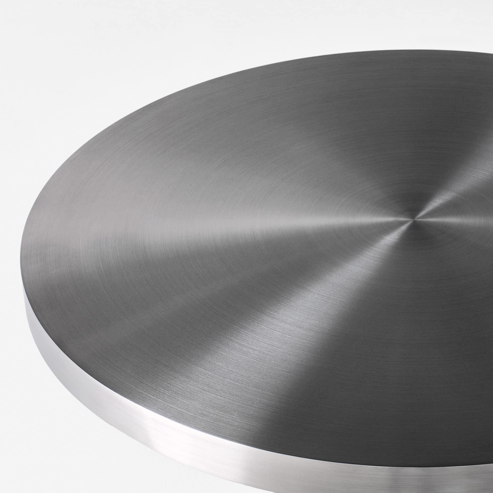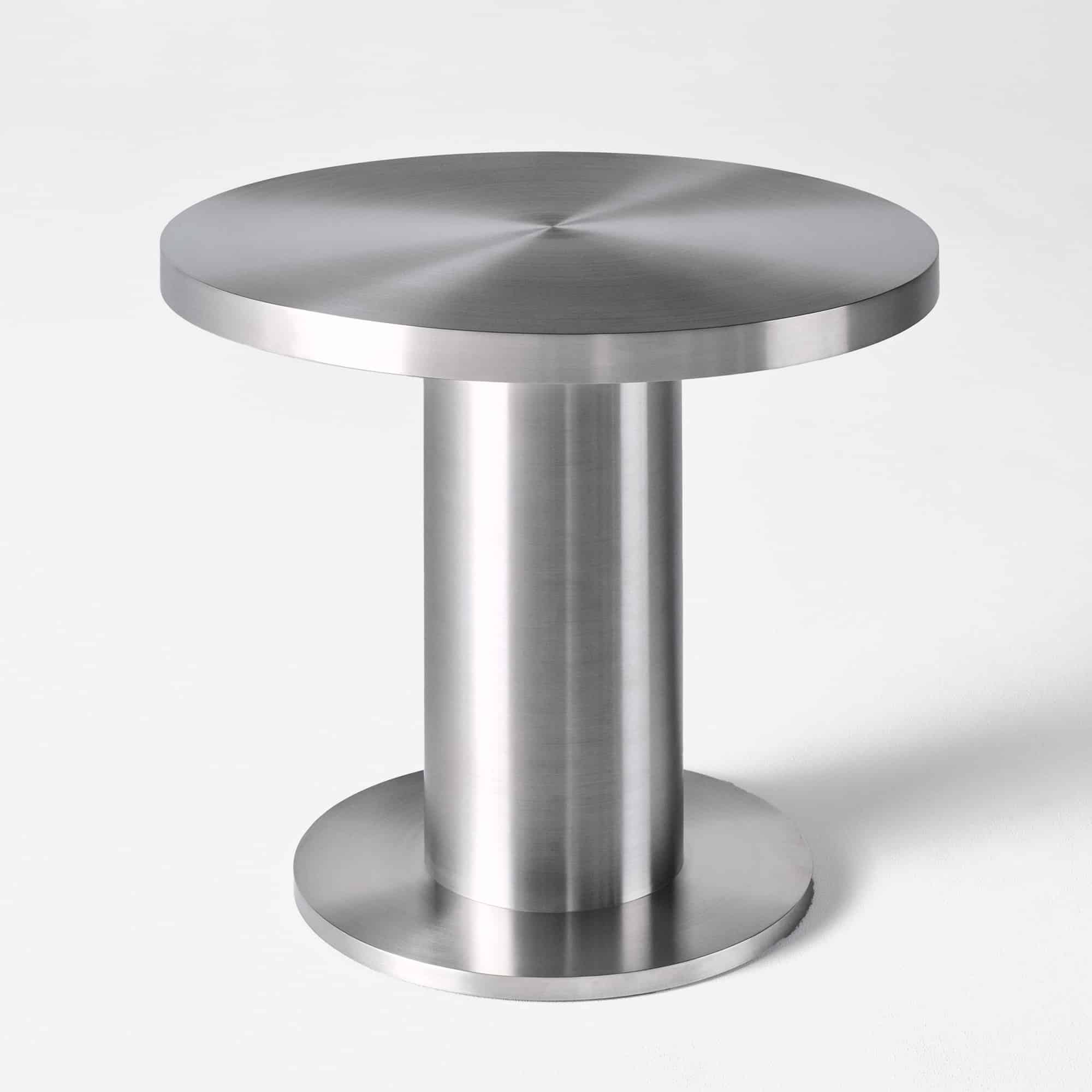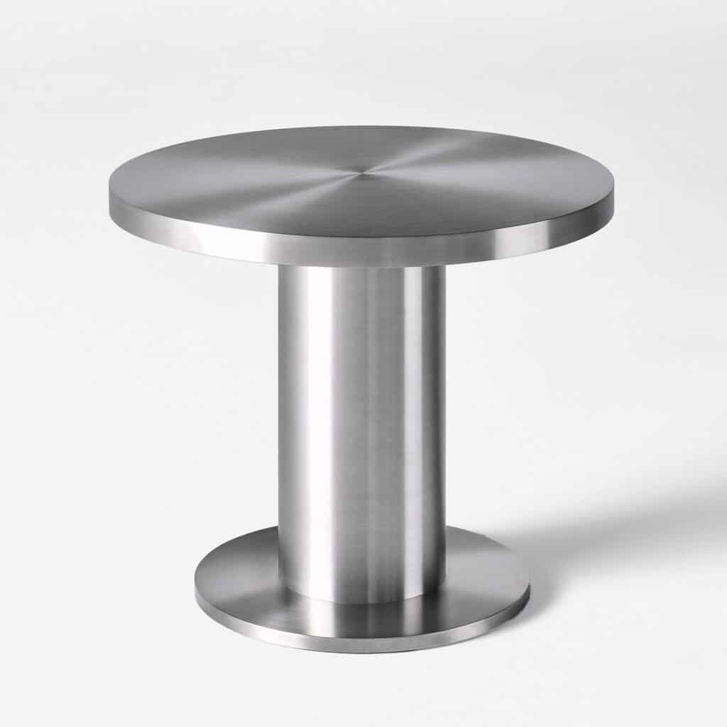 The Cufflink Dining Table is crafted in polished stainless steel, combining a sleek material with a sculptural, cufflink-inspired design. Its rounded forms create a soft silhouette, while the reflective finish adds a bold, modern presence. Available in two sizes.
