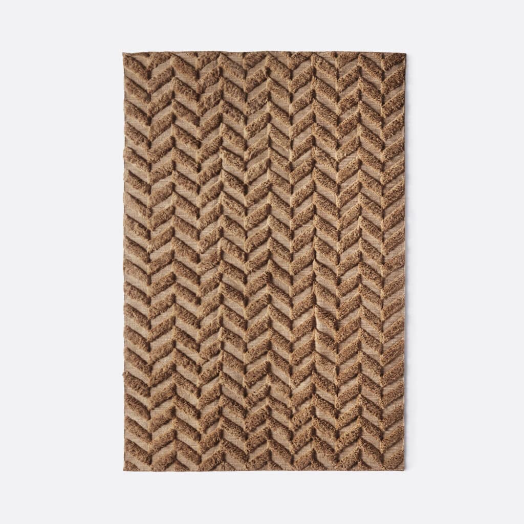 The Herringbone Brown Rug is handwoven from 100% wool, featuring a tone-on-tone herringbone pattern. The combination of flat weave and shaggy pile creates a subtle high–low texture with added depth.