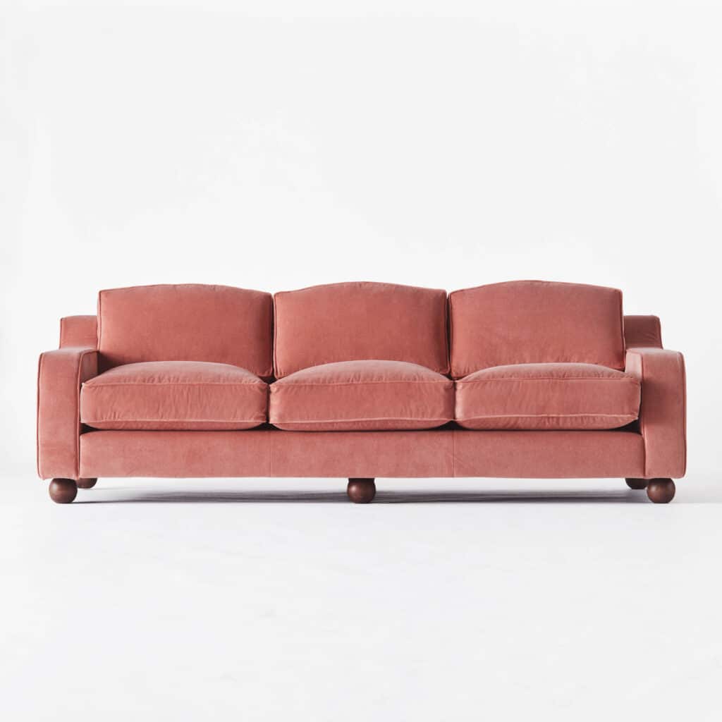 The Lola Sofa Velvet Vintage Pink features a soft, sculptural shape with an elegant, inviting feel. Upholstered in vintage pink velvet from JAB, it adds a warm, characterful touch to any space.
