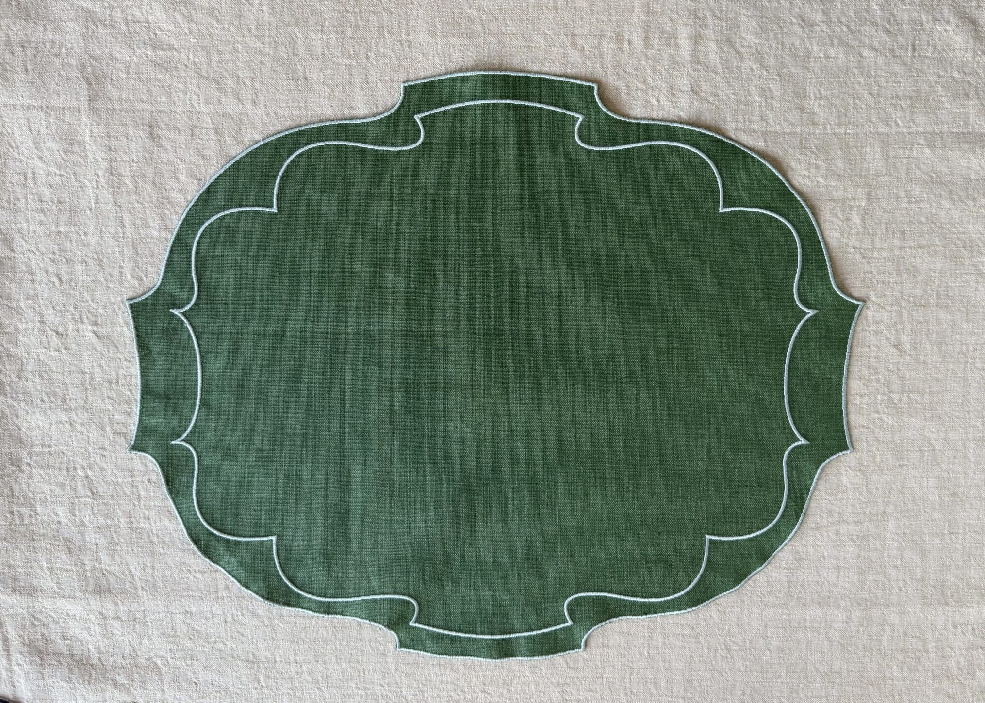 This coated linen placemat pairs elegant detailing with everyday function. The scalloped edges and double embroidered border create a soft, decorative frame, while each piece is hand-cut and finished in Italy for a refined, artisanal feel. Its coated finish makes it easy to care for—resistant to stains and water—making it ideal for both daily use and more styled table settings. Offered in a curated palette of colors, allowing for personal and playful combinations.