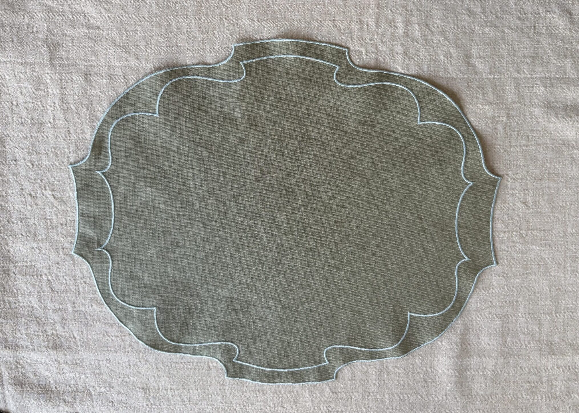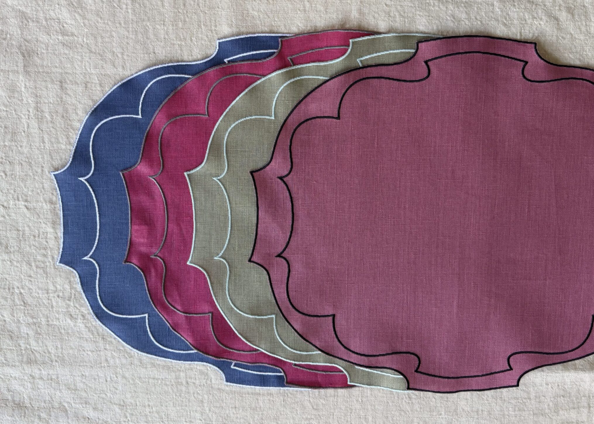 This coated linen placemat pairs elegant detailing with everyday function. The scalloped edges and double embroidered border create a soft, decorative frame, while each piece is hand-cut and finished in Italy for a refined, artisanal feel. Its coated finish makes it easy to care for—resistant to stains and water—making it ideal for both daily use and more styled table settings. Offered in a curated palette of colors, allowing for personal and playful combinations.
