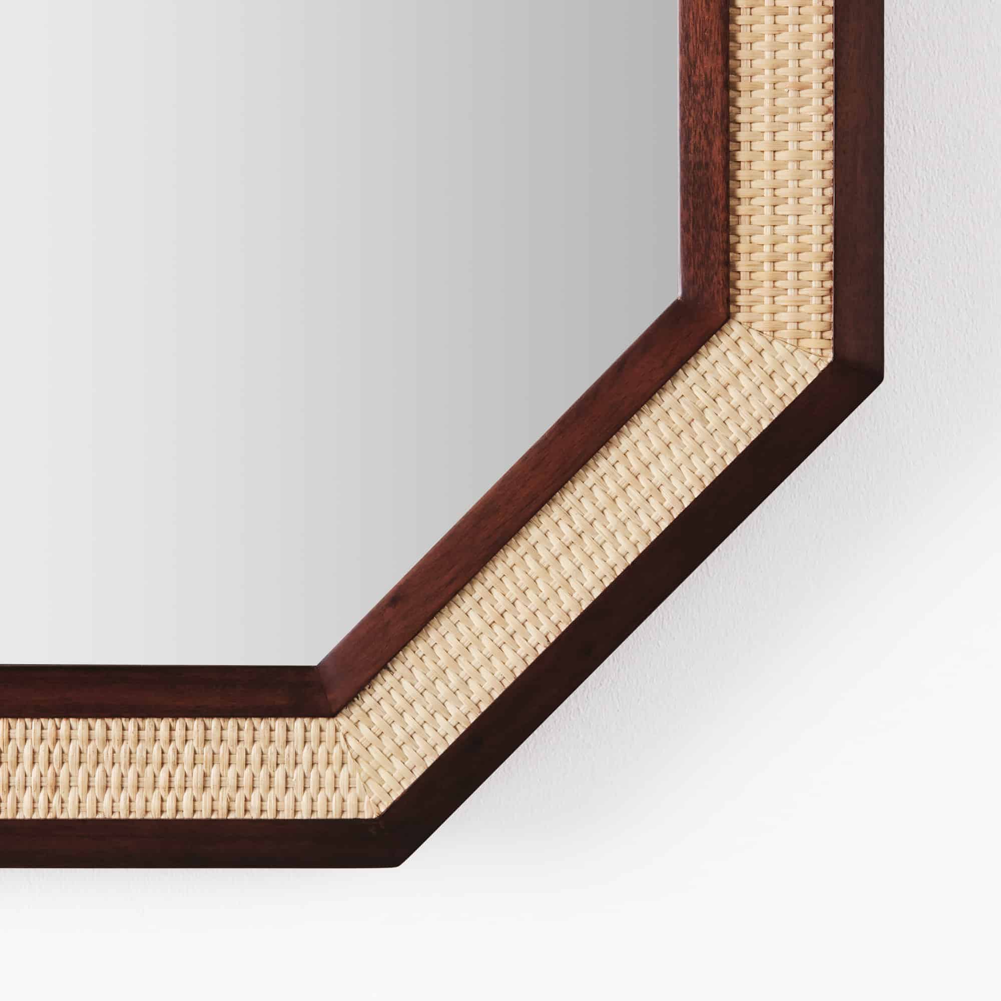 The Rattan Mirror Large features an octagonal frame crafted from cultivated mahogany, detailed with woven rattan inlays that contrast beautifully with the dark stained wood. The waxed finish gives the surface a smooth, matte look while enhancing its natural texture.