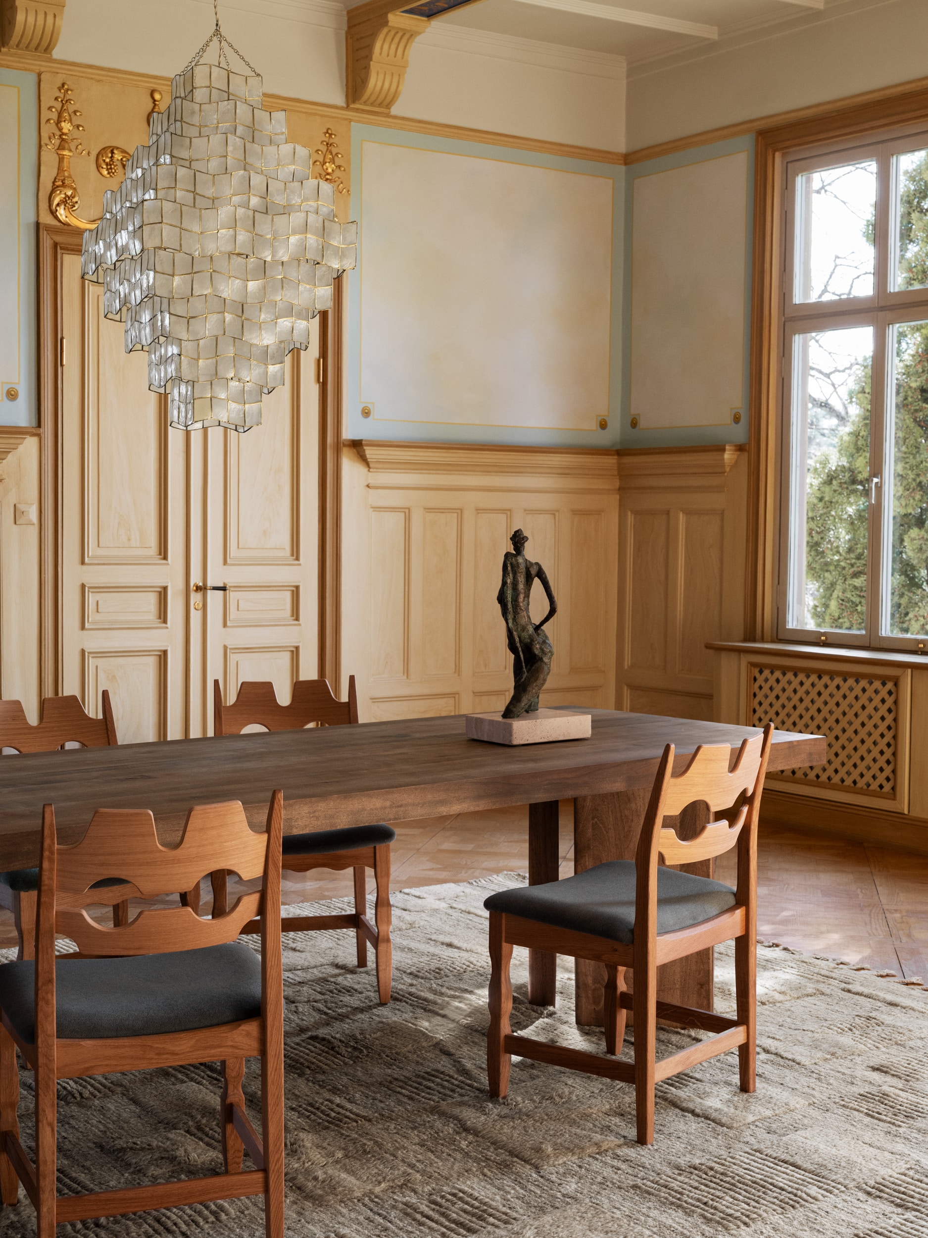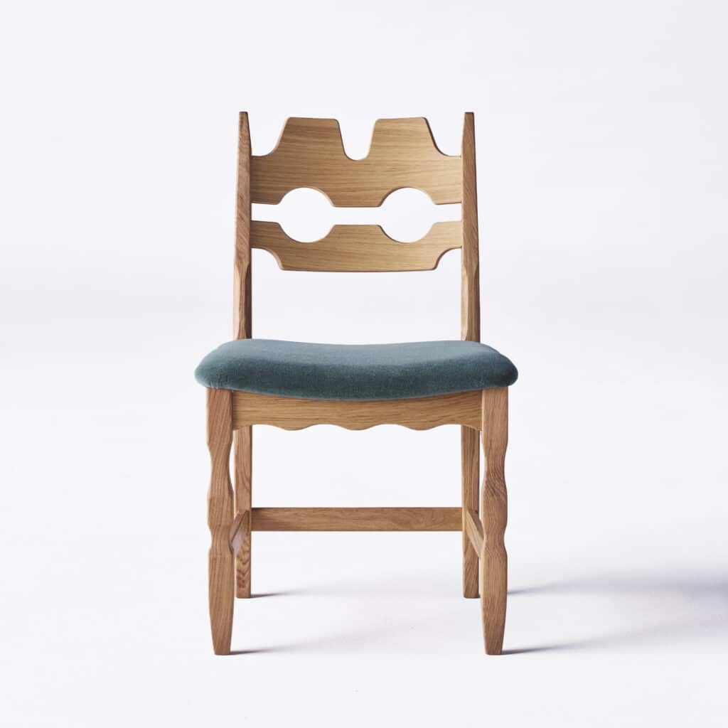 The Razor Blade Chair, designed by Henning Kjærnulf, is reintroduced in collaboration with his family. Crafted from solid oak, it features a distinctive cut-out backrest that defines its sculptural silhouette. Upholstered in soft mohair, it combines comfort with a strong, timeless character.