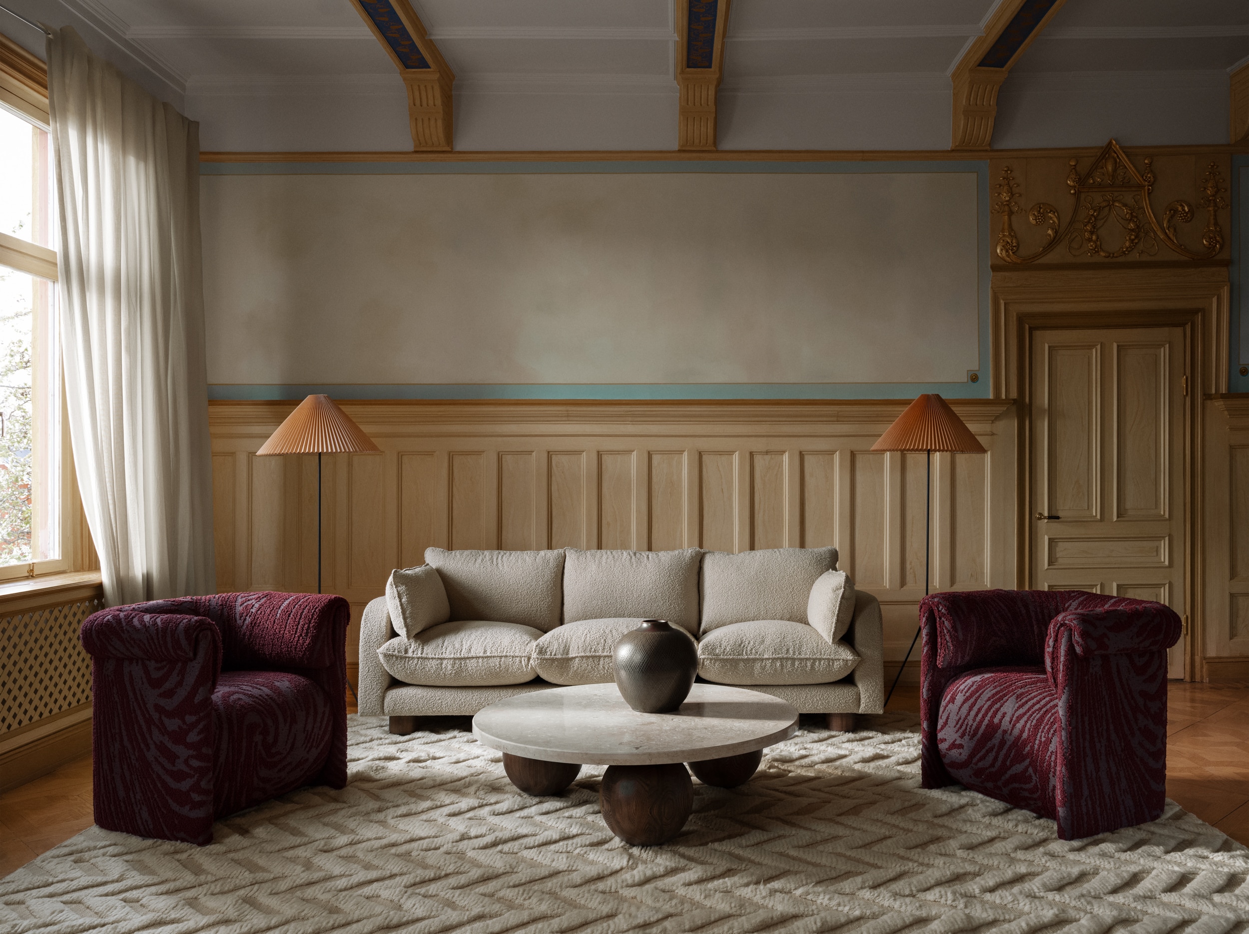 The Sphere Round Sofa Table combines a simple silhouette with bold, sculptural detail. Oversized spheres in dark stained beech support a substantial travertine top, creating a strong yet balanced expression.